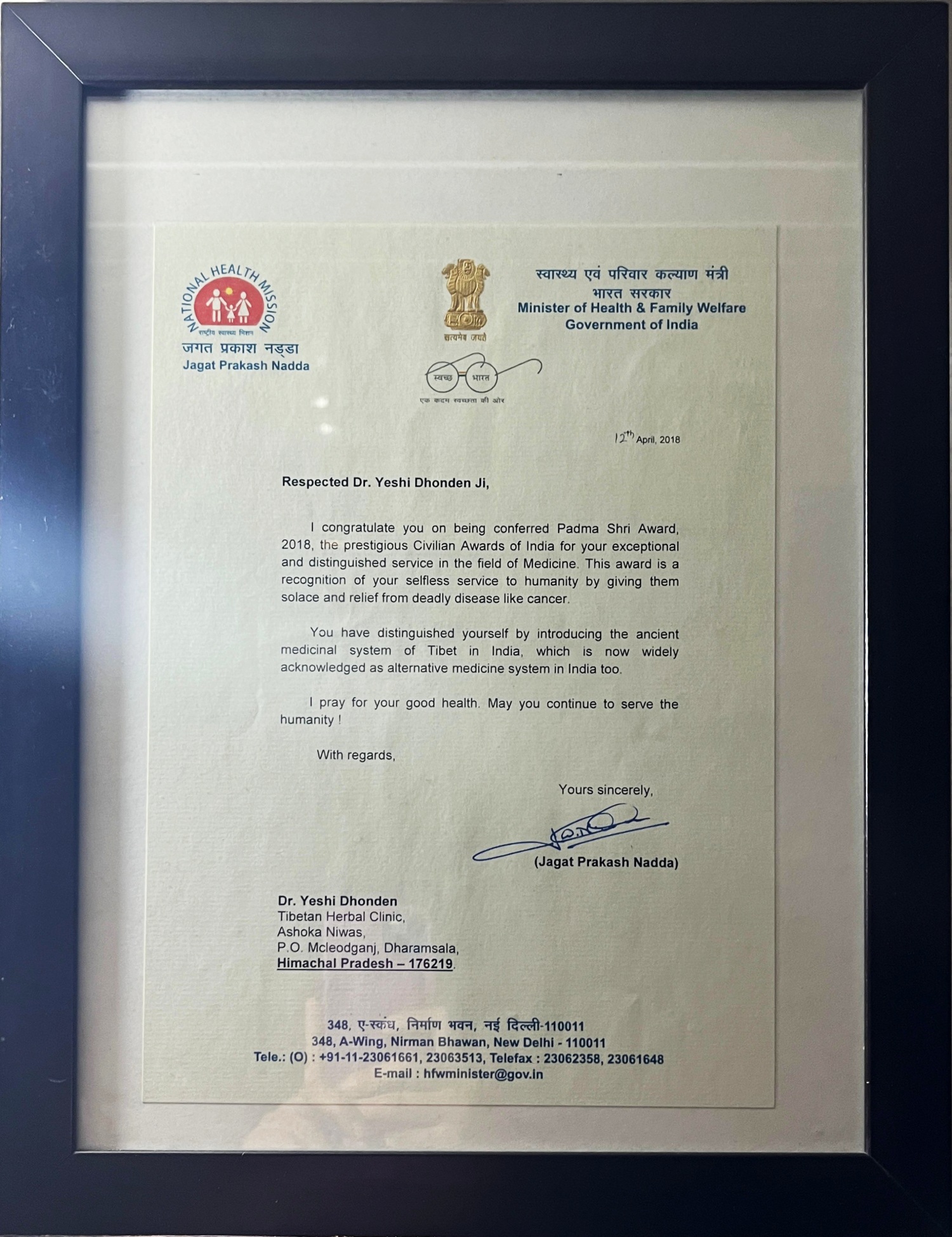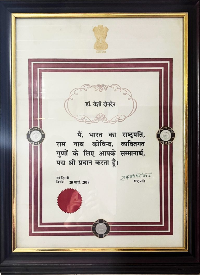 President of India Mr. Ram Nath Kovind Presenting Padma Shri Certificate to Dr. Yeshi Dhonden. 20th March, 2018.